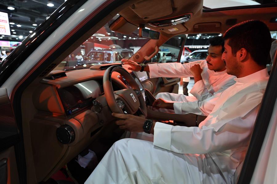 Visitors sit inside a vehicle at the booth of Chinese car brand BYD during the Auto World Show in Hawalli Governorate, Kuwait, Sept. 22, 2025. (Photo by Asad/Xinhua)