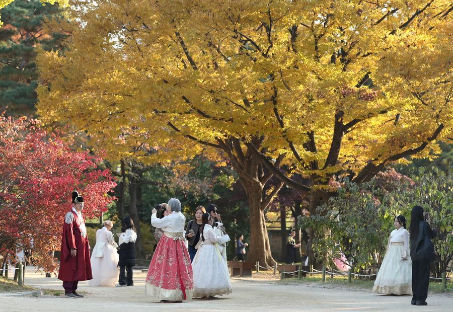 Tourists take photos at Gyeongbokgung Palace in Seoul, South Korea, Nov. 7, 2025. (Xinhua/Yao Qilin)