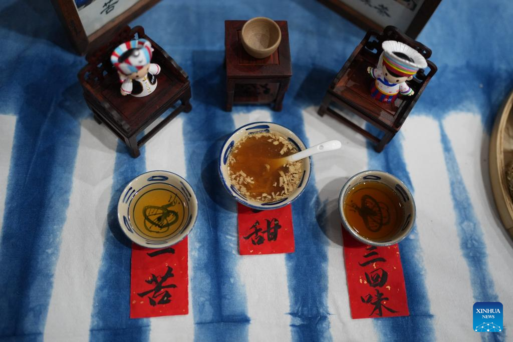 Chinese tea is displayed and offered to visitors during a Chinese New Year celebration event in Colombo, Sri Lanka, Jan. 27, 2026. The opening performance of the 2026 "Happy Chinese New Year" activities took place here Tuesday night, alongside an intangible cultural heritage exhibition. (Photo by Thilina Kaluthotage/Xinhua)