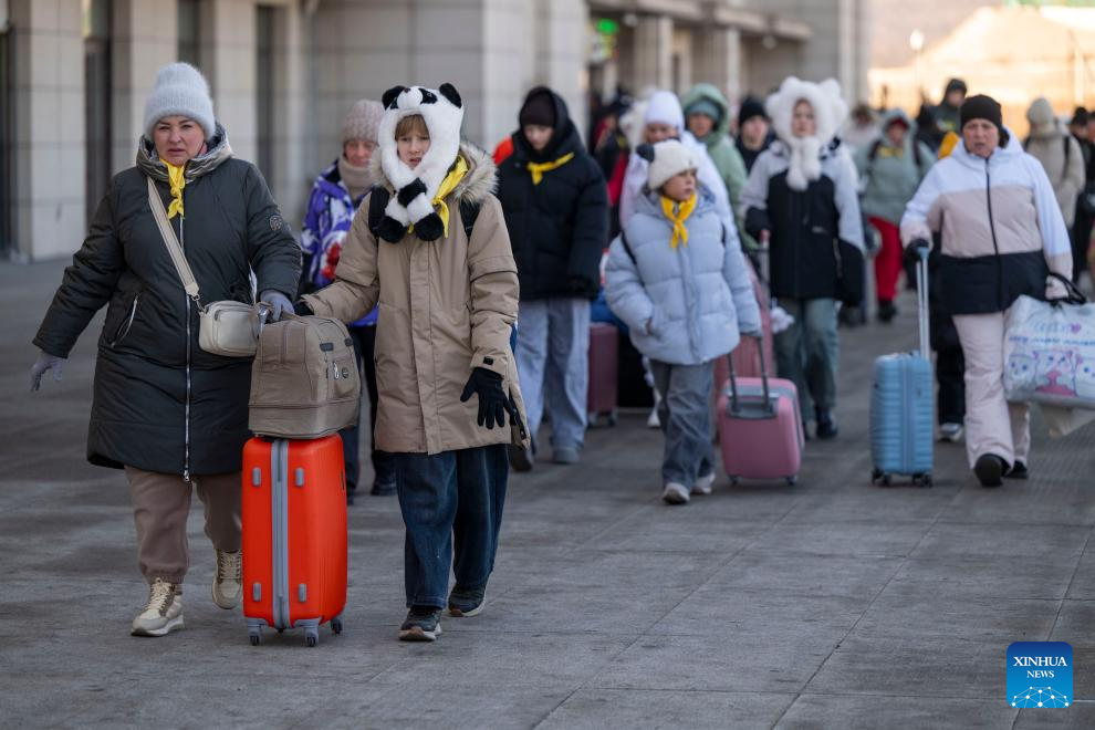 Foreign tourists walk out of Suifenhe Railway Station in Suifenhe, northeast China's Heilongjiang Province, on Jan. 8, 2026. (Xinhua/Zhang Tao)