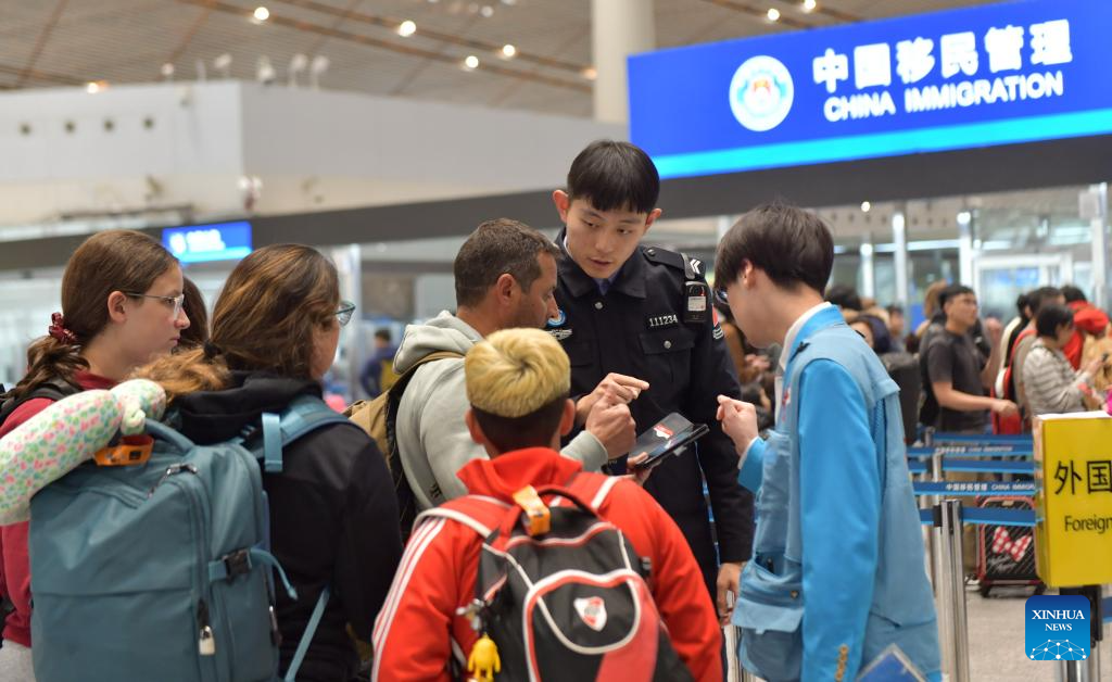 A police officer of the Beijing General Station of Exit and Entry Frontier Inspection provides information to foreign tourists at Beijing Capital International Airport in Beijing, capital of China, Jan. 9, 2026. (Photo by Zu Guobao/Xinhua)