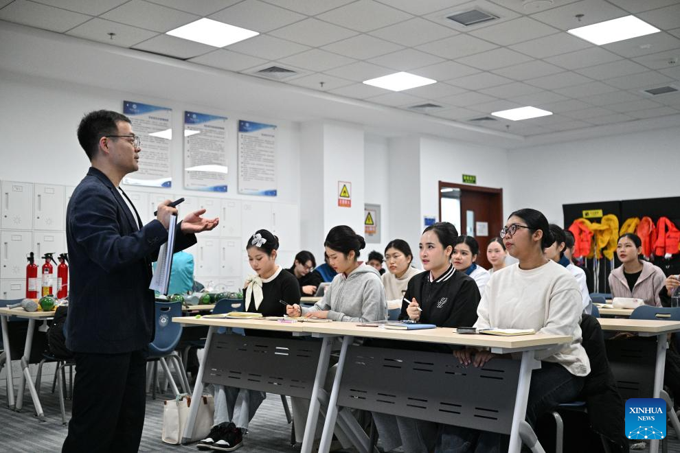 Thai students from Suan Dusit University learn cabin safety management during an exchange activity at the Civil Aviation University of China in Tianjin, north China, Jan. 8, 2026. (Xinhua/Sun Fanyue)