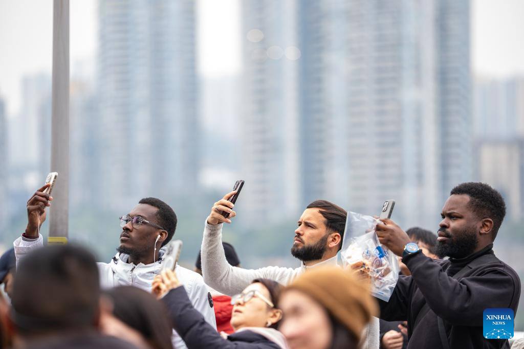 Foreign tourists take photos at a sightseeing platform of Liziba in Yuzhong District of southwest China's Chongqing, Jan. 7, 2026. (Xinhua/Huang Wei)