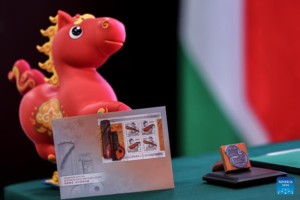 This photo taken on Feb. 4, 2026 shows the "National Treasures: Traditional Hungarian and Chinese Instruments" stamps at a launch ceremony in Budapest, Hungary. Hungary and China on Wednesday jointly issued a commemorative stamp series titled "National Treasures: Traditional Hungarian and Chinese Instruments" for the upcoming Chinese New Year. (Photo by David Balogh/Xinhua)