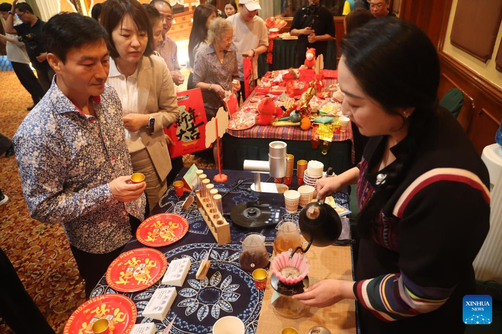 People taste coffee from China's Yunnan Province during the "Harbors Tonight" event in Bandar Seri Begawan, capital of Brunei, on Feb. 7, 2026. The "Harbors Tonight" event was held in Bandar Seri Begawan, the capital of Brunei, on Saturday night, promoting cultural and people-to-people exchange between China's Yunnan Province and Brunei. (Xinhua/Li Meng)