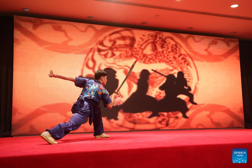 An actor performs Wushu during the "Harbors Tonight" event in Bandar Seri Begawan, capital of Brunei, on Feb. 7, 2026. The "Harbors Tonight" event was held in Bandar Seri Begawan, the capital of Brunei, on Saturday night, promoting cultural and people-to-people exchange between China's Yunnan Province and Brunei. (Xinhua/Li Meng)