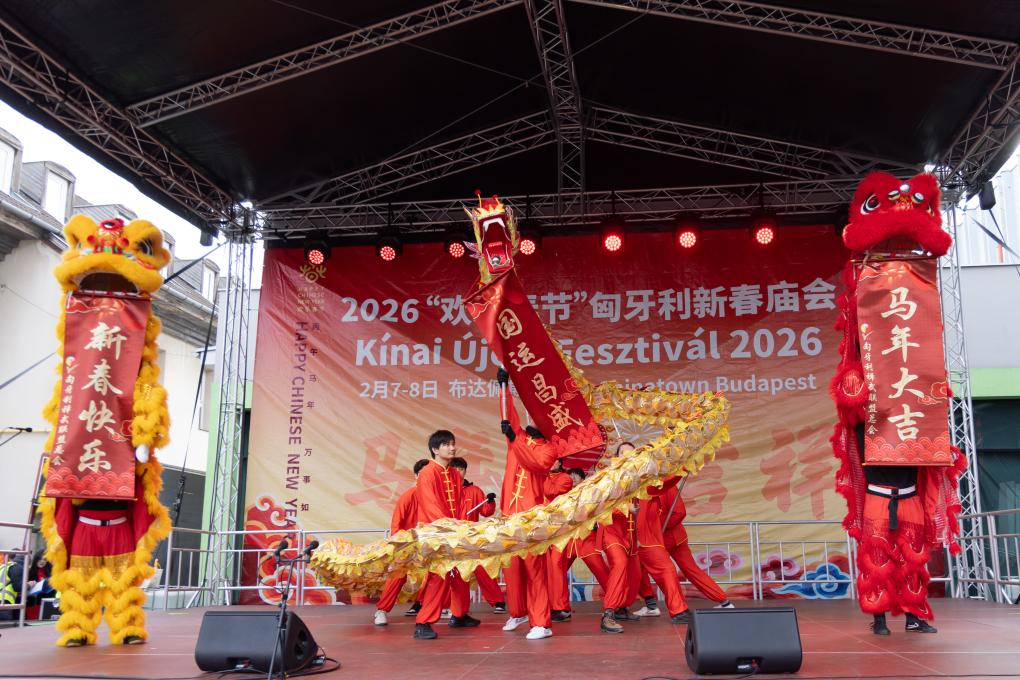 People perform dragon dance during the Budapest Chinatown Spring Festival Temple Fair in Budapest, Hungary, on Feb. 7, 2026. (Photo by Attila Volgyi/Xinhua)