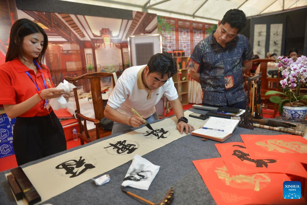 A visitor writes Chinese characters at a Chinese-Cambodian cultural exhibition in Phnom Penh, Cambodia, on Feb. 7, 2026. A Chinese-Cambodian cultural exhibition is being held in Phnom Penh, capital of Cambodia, to celebrate the upcoming Chinese New Year, or the Spring Festival.