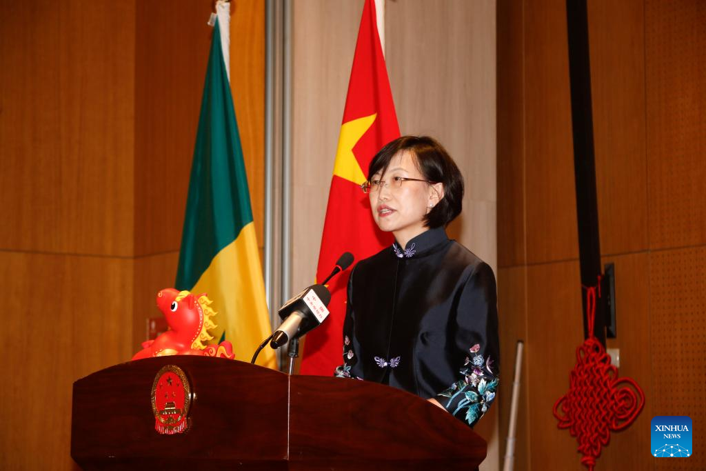 Li Fei, charge d'affaires at the Chinese Embassy in Senegal, delivers a speech at a Spring Festival reception in Dakar, capital of Senegal, Feb. 9, 2026. (Photo by Aliou Mbaye/Xinhua)