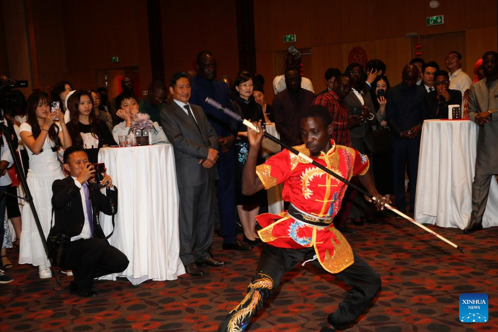 A member of the Senegalese Wushu Federation gives a performance at a Spring Festival reception in Dakar, capital of Senegal, Feb. 9, 2026. (Photo by Aliou Mbaye/Xinhua)