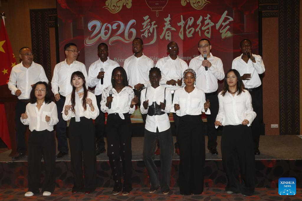 Teachers and students from the Confucius Institute at Cheikh Anta Diop University of Dakar perform a Chinese song at a Spring Festival reception in Dakar, capital of Senegal, Feb. 9, 2026. (Photo by Aliou Mbaye/Xinhua)