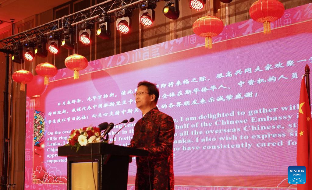 Chinese Ambassador to Sri Lanka Qi Zhenhong delivers a speech at a Chinese New Year reception in Colombo, Sri Lanka, Feb. 9, 2026. (Xinhua/Wu Ziyu)