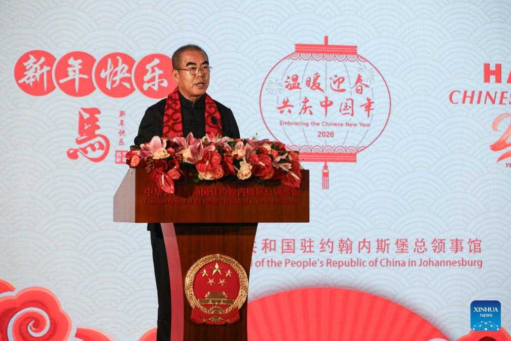 Chinese Consul General in Johannesburg Pan Qingjiang addresses a reception to celebrate the upcoming Chinese New Year in Johannesburg, South Africa, Feb. 9, 2026. (Xinhua/Chen Wei)