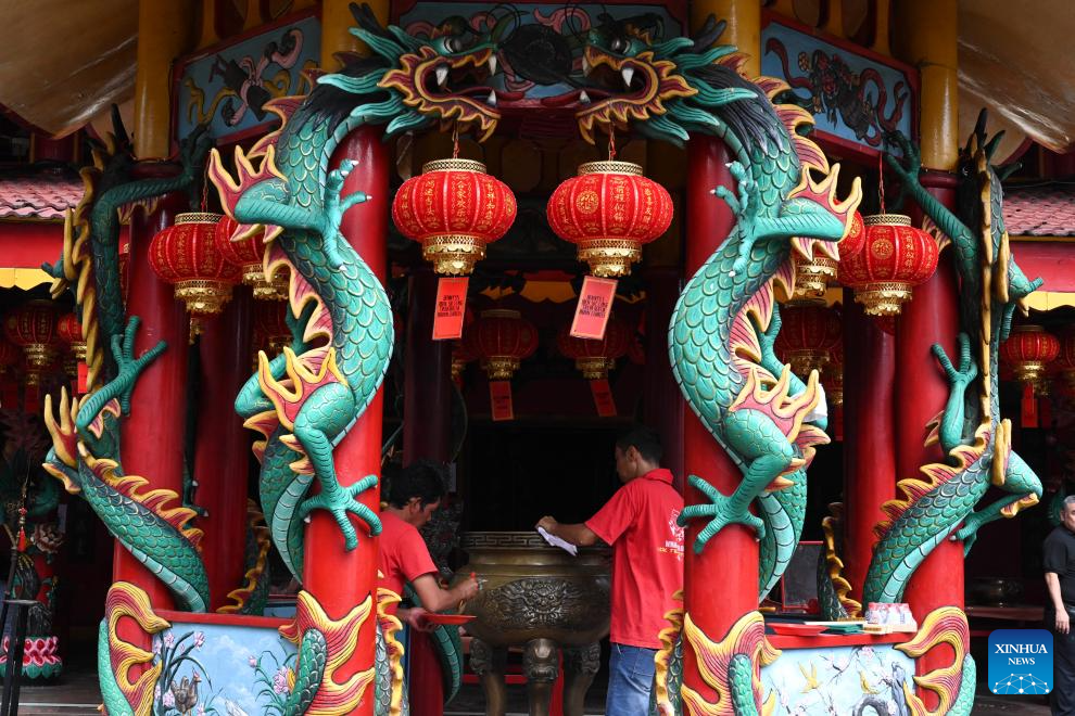 Two workers make preparations for the Chinese New Year celebration in Amurva Bhumi temple in Jakarta, Indonesia, Feb. 10, 2026. (Xinhua/Zulkarnain)