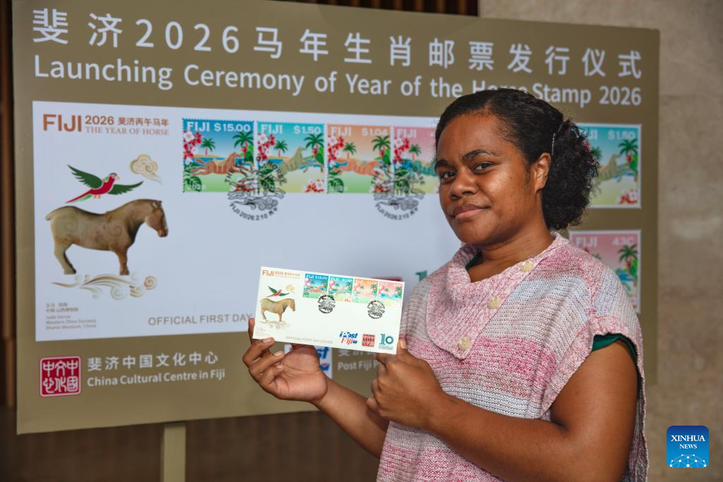 A woman shows an official first day cover with the newly-issued Year of the Horse stamps in Suva, Fiji, Feb. 10, 2026. Post Fiji and the China Cultural Center in Fiji jointly issued a set of commemorative stamps marking the upcoming Chinese New Year of the Horse in the capital city of Suva on Tuesday evening. (Photo by Chen Peng/Xinhua)