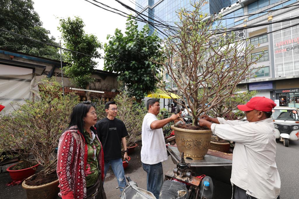 People buy plum blossom saplings as Chinese New Year decorations near the Orussey Market in Phnom Penh, Cambodia on Feb. 12, 2026. (Photo by Sovannara/Xinhua)