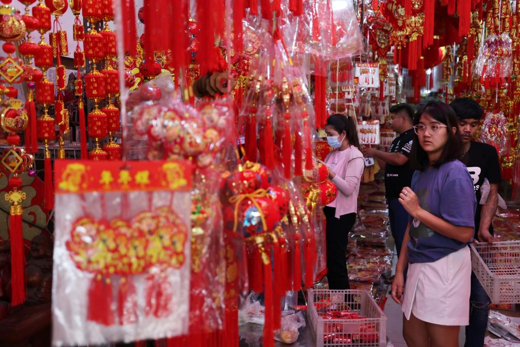 People buy Chinese New Year decorations at a shop near the Orussey Market in Phnom Penh, Cambodia on Feb. 12, 2026. (Photo by Sovannara/Xinhua)
