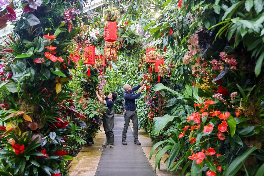Members of staff put the finishing touches to floral displays of orchids ahead of the Orchid Festival at Kew Gardens in London, Britain, Feb. 5, 2026. (Xinhua)