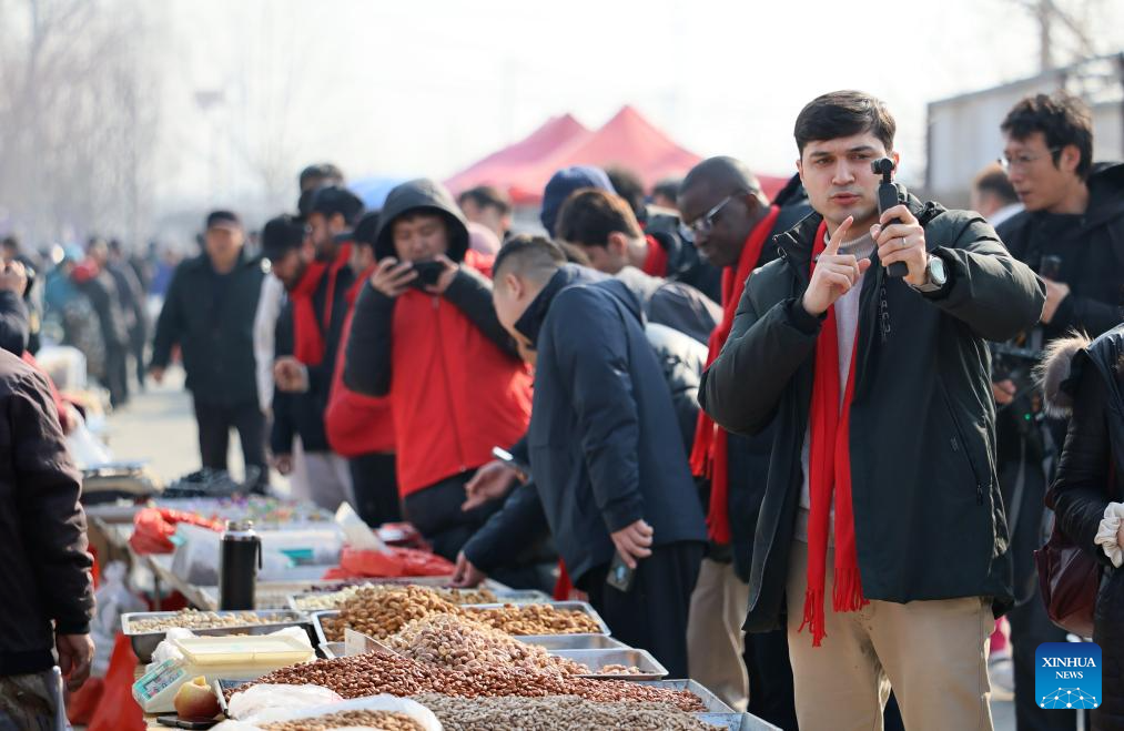 Umar Suleimanov, a 26-year-old Tajik student from Nankai University, records a vlog at a time-honored fair in Jizhou, north China's Tianjin Municipality, Feb. 10, 2026. [Photo/Xinhua]