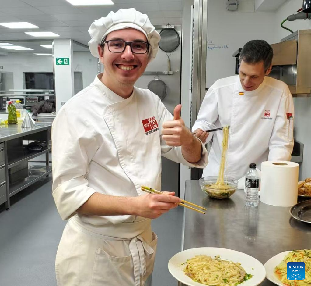 Local vocational students of an international Lamian beef noodle chef training program taste their handmade beef noodles at the I.E.S. Hotel Escuela in Madrid, Spain, in January 2026. (Lanzhou Resource and Environment Vocational and Technical University/Handout via Xinhua)
