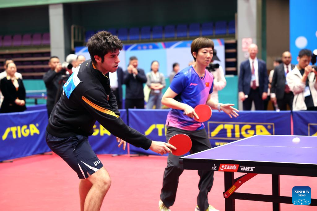 A China-U.S. table tennis friendly match is pictured in Shijiazhuang, north China's Hebei Province, April 11, 2026. (Xinhua/Lu Ye)