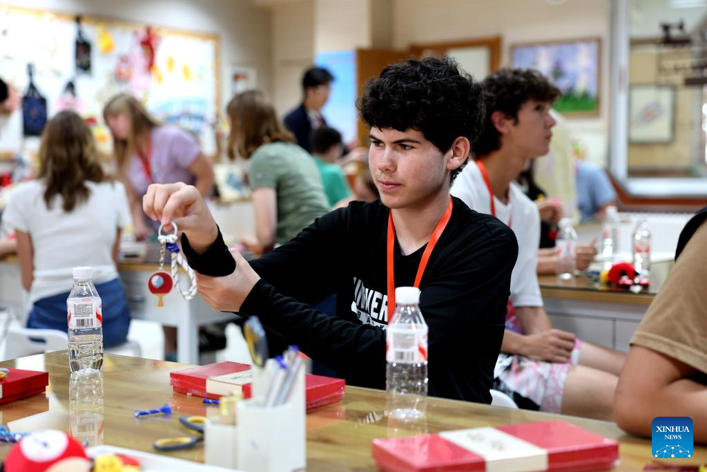 A student from the United States makes a handicraft at a school in Shijiazhuang, north China's Hebei Province, April 11, 2026. (Xinhua/Lu Ye)