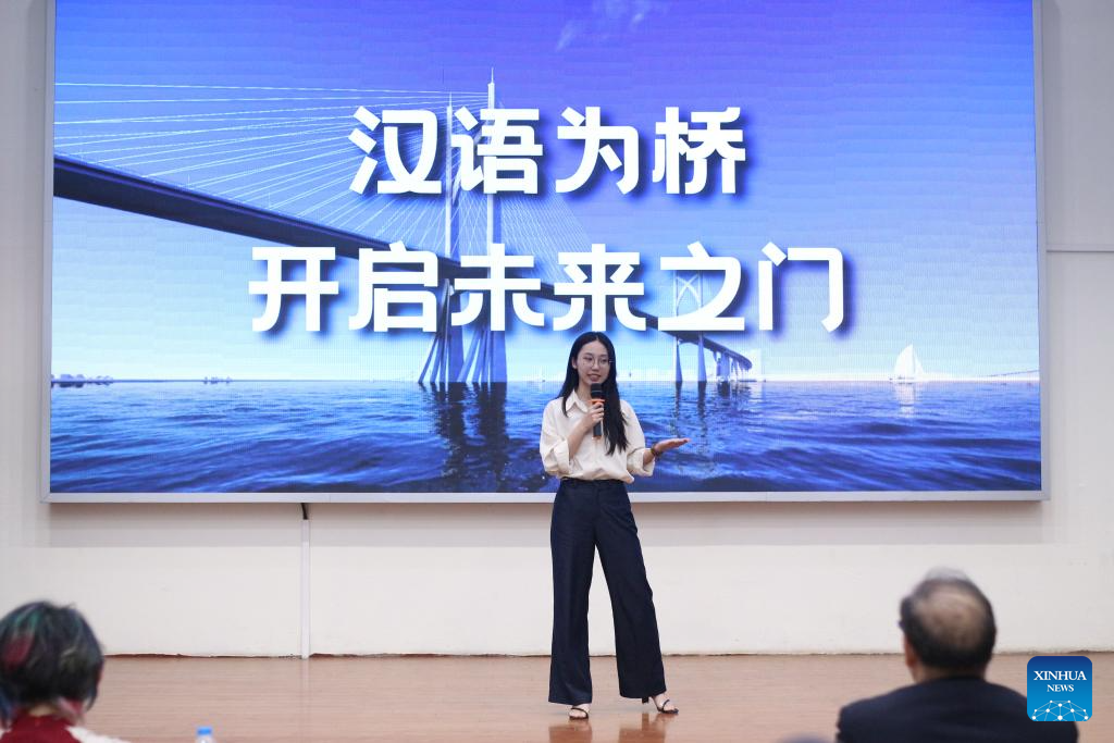 A student delivers a speech during a celebration marking the United Nations Chinese Language Day at the University of Languages and International Studies under Vietnam National University in Hanoi, Vietnam, April 15, 2026. (University of Languages and International Studies under Vietnam National University/Handout via Xinhua)