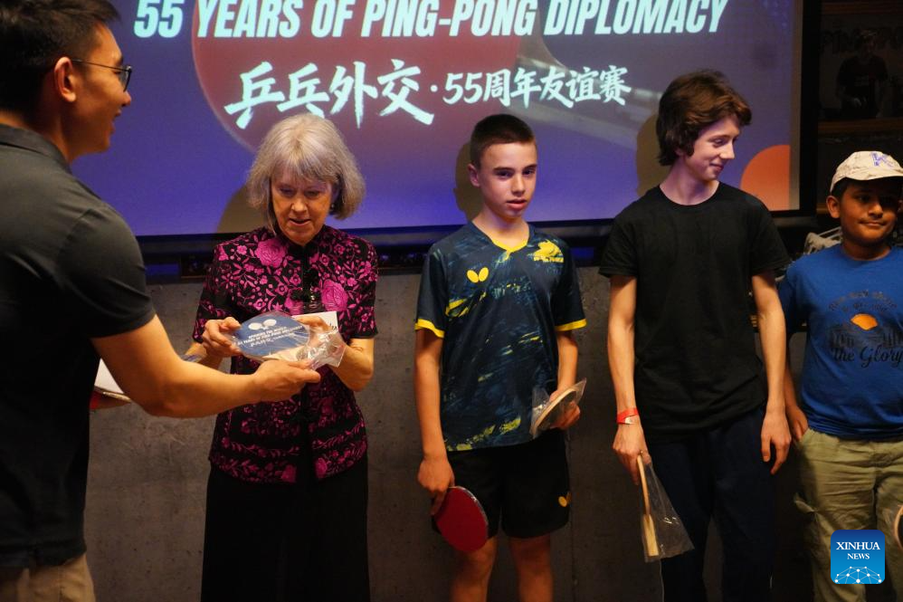 Rory Hayden (2nd L), who served as an interpreter for the Chinese table tennis team during its U.S. tour while in her 20s, prepares to present awards to children during an event marking the 55th anniversary of "Ping-Pong diplomacy" in New York, the United States, April 17, 2026. Chinese and U.S. table tennis athletes, university representatives and local enthusiasts gathered here on Friday to mark the 55th anniversary of "Ping-Pong Diplomacy," celebrating the enduring friendship fostered through sports exchanges.(Xinhua/Zhang Fengguo)