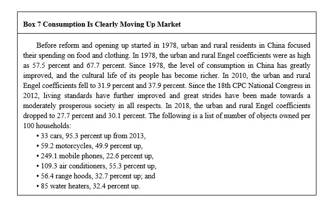China has the most promising consumer market in the world. It is not only "the world's factory", but also a global market. With a population of nearly 1.4 billion and a middle-income group of 400 million, China has the largest market in the world. The sustained and healthy development of China's economy has created extensive demand in many fields and provided an important engine for economic development. China has huge space and potential for consumption, which is clearly moving up market and making a growing contribution to the economy. The consumption growth rate has surpassed that of fixed asset investment, and its gradient effect is prominent (see Box 7). According to an MGI report, China is the world's largest market in many categories, including automobiles, alcohol and mobile phones, accounting for about 30 percent of global consumption.11 Its huge consumer demand provides an enormous market for countries all over the world. In the coming 15 years, China's imports of goods and services are expected to exceed US$30 trillion and US$10 trillion.