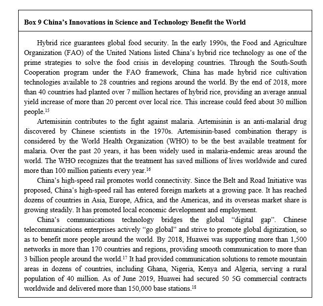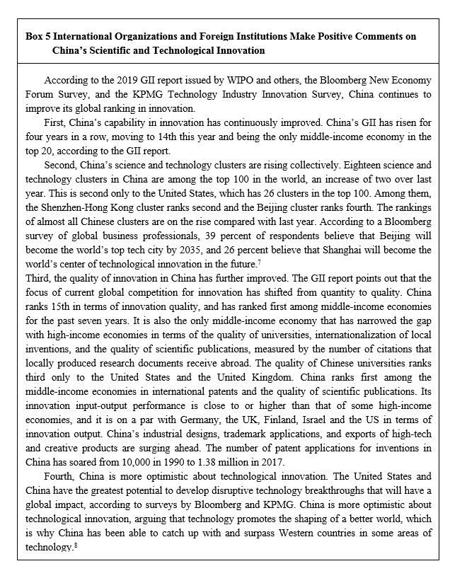 China's scientific and technological innovations have injected new momentum into world economic growth. In recent years, investment in the field of science and technology in China has been increasing, and major scientific and technological innovations have emerged. In 2018, China's R&D spending accounted for 2.19 percent of GDP. According to the Global Innovation Index (GII) released by the World Intellectual Property Organization (WIPO6) and other organizations, China continued its rise in 2019, moving from 17th in 2018 to 14th (see Box 5); it is the only middle-income economy in the top 20.6In the field of high technology, China is catching up and getting ahead. Quantum communications, supercomputing, aerospace, artificial intelligence, fifth-generation mobile network technology (5G), mobile payment, new energy vehicles, high-speed rail, and financial technology are sectors in which China leads the world. China's innovations in science and technology have been widely applied, bringing more convenience to the work and daily life of people of other countries, and injecting new momentum into world economic growth.