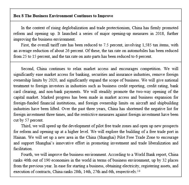 China continues to optimize its business environment, giving foreign manufacturers and investors a broader space and a better business environment (see Box 8). China has implemented a wide range of trade and investment liberalization and facilitation policies, formulated the Foreign Investment Law, and implemented the system of pre-establishment national treatment plus a negative list across the board. It continues to relax market access, and has made great efforts to establish pilots for opening wider to the world.
