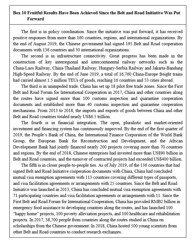 We will build a high-quality Belt and Road together with our partners. The Belt and Road Initiative is based on the principles of extensive consultation, joint contribution and shared benefits, and is guided by the Silk Road spirit characterized by peace, cooperation, openness, inclusiveness, mutual learning and mutual benefit. With a focus on policy coordination, connectivity of infrastructure, unimpeded trade, financial integration and closer people-to-people ties, it has transformed from ideas into action, from vision into reality, from a conceptual initiative into a globally popular public product (see Box 10). In November 2016, the United Nations adopted a resolution welcoming economic cooperation initiatives such as the Belt and Road Initiative. In March 2017, the United Nations Security Council called on all countries in its resolution to promote the initiative and the building of a global community of shared future. The Belt and Road Initiative originated in China, but the opportunities and achievements belong to the whole world. According to a World Bank research report, the initiative will help 7.6 million people out of extreme poverty and 32 million out of moderate poverty. It will increase trade in participating countries by 2.8 to 9.7 percent, global trade by 1.7 to 6.2 percent and global income by 0.7 to 2.9 percent.19 The initiative is a veritable road to resource sharing, shared prosperity and common development.