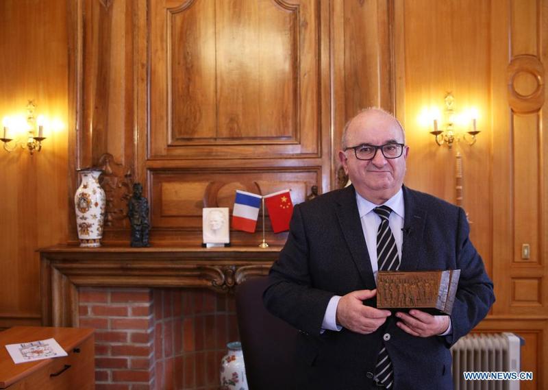 Benoit Digeon, mayor of Montargis, poses with a miniature of a sculpture of a group of Chinese revolutionaries to mark the centennial of the Work-Study Movement during an interview with Xinhua, in Montargis, France, March 22, 2021. Starting in 1919, thousands of progressive young Chinese went to France, where they worked in factories in Paris, Lyon and Montargis to pay for their studies in the European country. (Xinhua/Gao Jing)