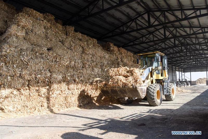 A worker driving a forklift conveys fodder at an animal husbandry company in Manas County, northwest China's Xinjiang Uygur Autonomous Region, Oct. 19, 2020. Manas introduced Suffolk sheep in 1989. The county has accumulated experience on sheep breeding and improved the quality of its mutton products. In recent years, local people have promoted their high-quality mutton products in the market in Beijing and Shanghai via e-commerce platform to boost villagers' income. [Photo/Xinhua]