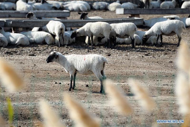 Photo taken on Oct. 19, 2020 shows a herd of Suffolk sheep at an animal husbandry company in Manas County, northwest China's Xinjiang Uygur Autonomous Region. Manas introduced Suffolk sheep in 1989. The county has accumulated experience on sheep breeding and improved the quality of its mutton products. In recent years, local people have promoted their high-quality mutton products in the market in Beijing and Shanghai via e-commerce platform to boost villagers' income. [Photo/Xinhua]