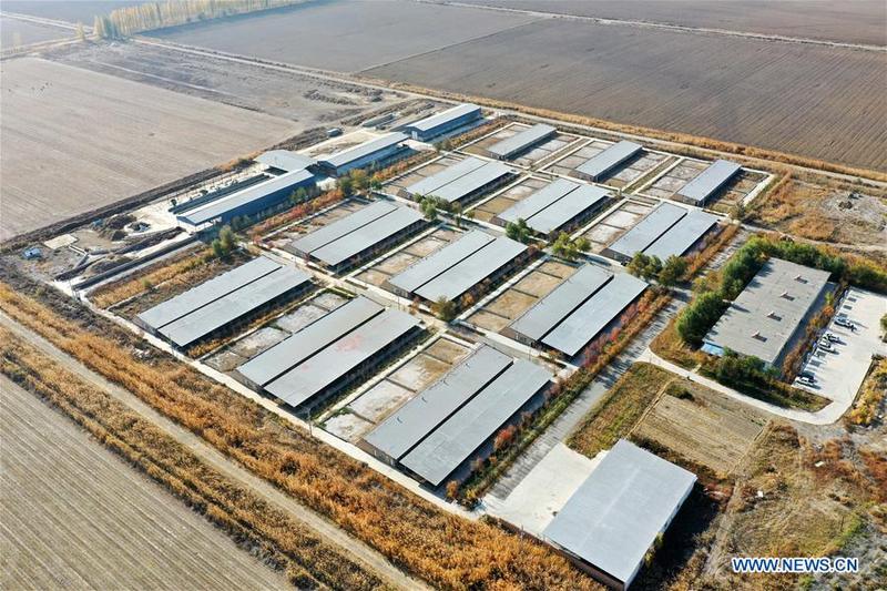 Aerial photo taken on Oct. 19, 2020 shows an animal husbandry company in Manas County, northwest China's Xinjiang Uygur Autonomous Region. Manas introduced Suffolk sheep in 1989. The county has accumulated experience on sheep breeding and improved the quality of its mutton products. In recent years, local people have promoted their high-quality mutton products in the market in Beijing and Shanghai via e-commerce platform to boost villagers' income. [Photo/Xinhua]