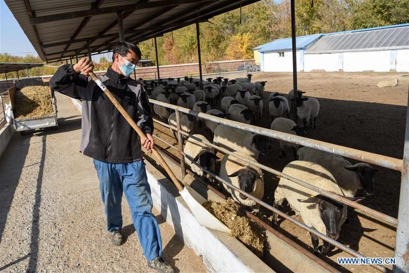 A worker feeds Suffolk sheep at an animal husbandry company in Manas County, northwest China's Xinjiang Uygur Autonomous Region, Oct. 19, 2020. Manas introduced Suffolk sheep in 1989. The county has accumulated experience on sheep breeding and improved the quality of its mutton products. In recent years, local people have promoted their high-quality mutton products in the market in Beijing and Shanghai via e-commerce platform to boost villagers' income. [Photo/Xinhua]