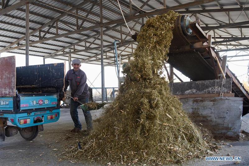 A worker loads fodder onto a vehicle at an animal husbandry company in Manas County, northwest China's Xinjiang Uygur Autonomous Region, Oct. 19, 2020. Manas introduced Suffolk sheep in 1989. The county has accumulated experience on sheep breeding and improved the quality of its mutton products. In recent years, local people have promoted their high-quality mutton products in the market in Beijing and Shanghai via e-commerce platform to boost villagers' income. [Photo/Xinhua]