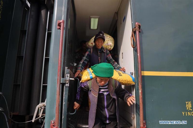 A woman of Yi ethnic group (rear) from Liangshan Yi Autonomous Prefecture gets off a train at Lianhexiang Railway Station along Chengdu-Kunming Railway in southwest China's Sichuan Province, Oct. 3, 2020. Compared with high-speed trains in many parts of China, the train 5633/5634 running through Liangshan Yi Autonomous Prefecture seems outdated and slow. But for the local residents living in the remote mountainous areas, the train, which has served for over 30 years with constant ticket price, not only brings them to the outside destinations but also brings them hope of shaking off poverty. [Photo/Xinhua]