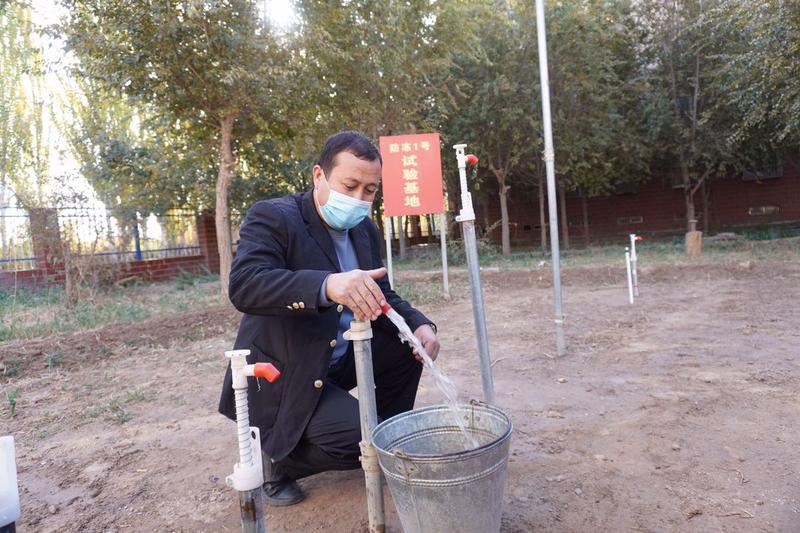 Wushoujiang Mamuti, manager of the valve company's Tumxuk branch, demonstrates how to use the patented valve that makes running water available in winter on Oct 22, 2020 in Tumxuk, Xinjiang Uygur autonomous region. [Photo /chinadaily.com.cn]