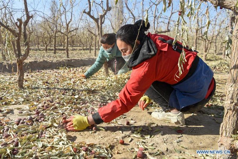 Farmers collects red jujubes in Hotan County of Hotan Prefecture, northwest China's Xinjiang Uygur Autonomous Region, Nov. 6, 2020. A total of 890,000 mu (about 59,333 hectares) of red jujubes have entered harvest season in the prefecture. The jujube trees cultivation here has increased local villagers' income in recent years. [Photo/Xinhua]