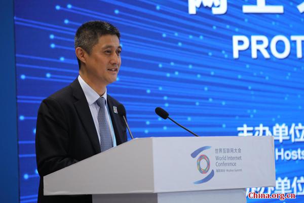 Gao Anming, vice president of China International Publishing Group, hosts the sub-forum "Protection of Minors Online and Governance of Internet Ecology" at the 2019 World Internet Conference (WIC) in Wuzhen, Zhejiang Province. [Photo/China.org.cn]