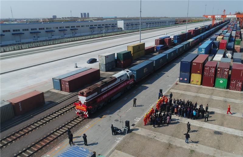 A China-Europe freight train departs from the Qingdao demonstration area. [Photo/Xinhua]