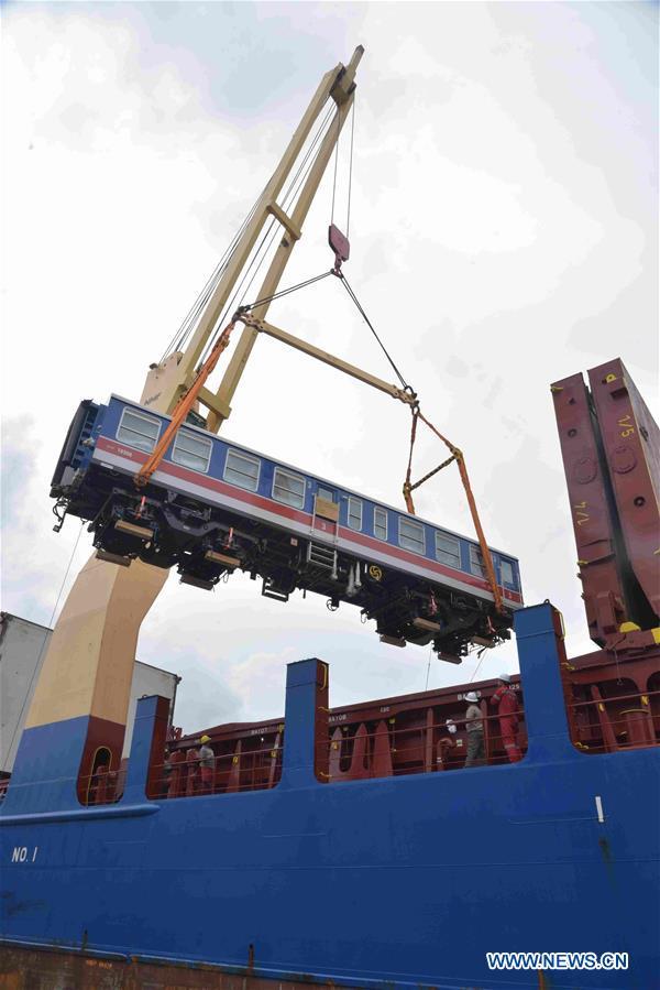 One of the carriages of an imported Chinese-made train is unloaded at Colombo port in Sri Lanka, Aug. 13, 2019. [Photo/Xinhua]