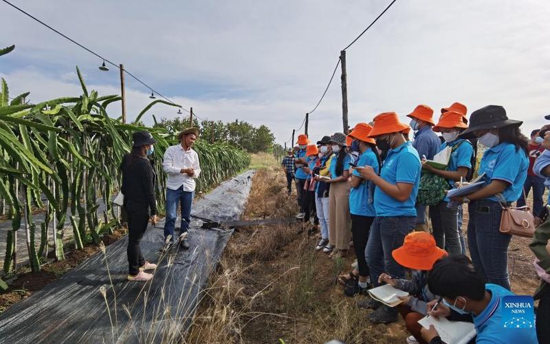 Cambodian agriculture students visit a dragon fruit orchard in Kratie province, Cambodia on Dec. 4, 2021. A week-long Chinese-organized training workshop on standardized banana production technologies for Cambodian agriculture students concluded on Sunday. During the course, more than 50 students took part in both theoretical studies and field trips to several tropical fruit orchards. (Chen Qisheng/Handout via Xinhua)