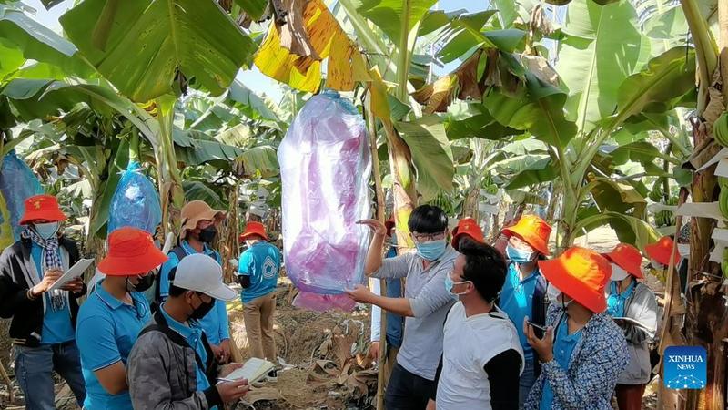 Cambodian agriculture students visit a banana orchard in Kratie province, Cambodia on Dec. 4, 2021. A week-long Chinese-organized training workshop on standardized banana production technologies for Cambodian agriculture students concluded on Sunday. During the course, more than 50 students took part in both theoretical studies and field trips to several tropical fruit orchards. (Chen Qisheng/Handout via Xinhua)