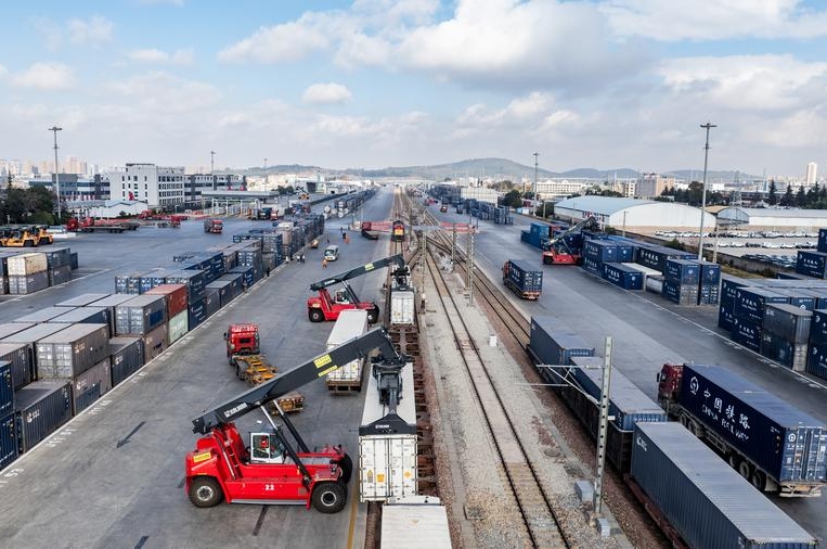 An international cargo train of China-Laos Railway is pictured at Wangjiaying West Station in Kunming, southwest China's Yunnan Province, on Jan. 2, 2025. (Xinhua/Hu Chao)