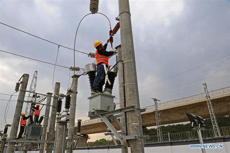 Electricians set the electric system for the Hangzhou-Huangshan high-speed railway in Tonglu County, east China's Zhejiang Province, April 1, 2018.