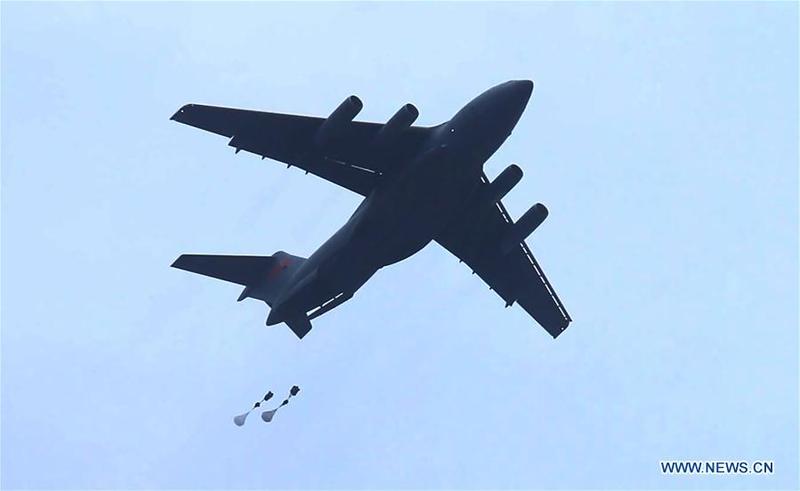 In this undated file photo, China's Y-20 heavy transport aircraft takes part in an airborne and air delivery training. China's Y-20 heavy transport aircraft has undergone its first airborne and air delivery training, said the Chinese air force on Tuesday. According to Shen Jinke, spokesperson of the air force, it marked a leap in the air force's strategic delivery and long-distance airborne combat abilities. [Photo/Xinhua]