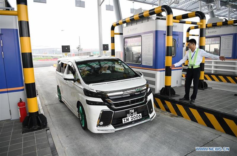 A car from Zhuhai heading to Hong Kong goes through the toll gate of the Hong Kong-Zhuhai-Macao Bridge, Oct. 24, 2018. The Hong Kong-Zhuhai-Macao bridge, the world's longest cross-sea bridge, opened to public traffic at 9 a.m. Wednesday. [Photo/Xinhua]